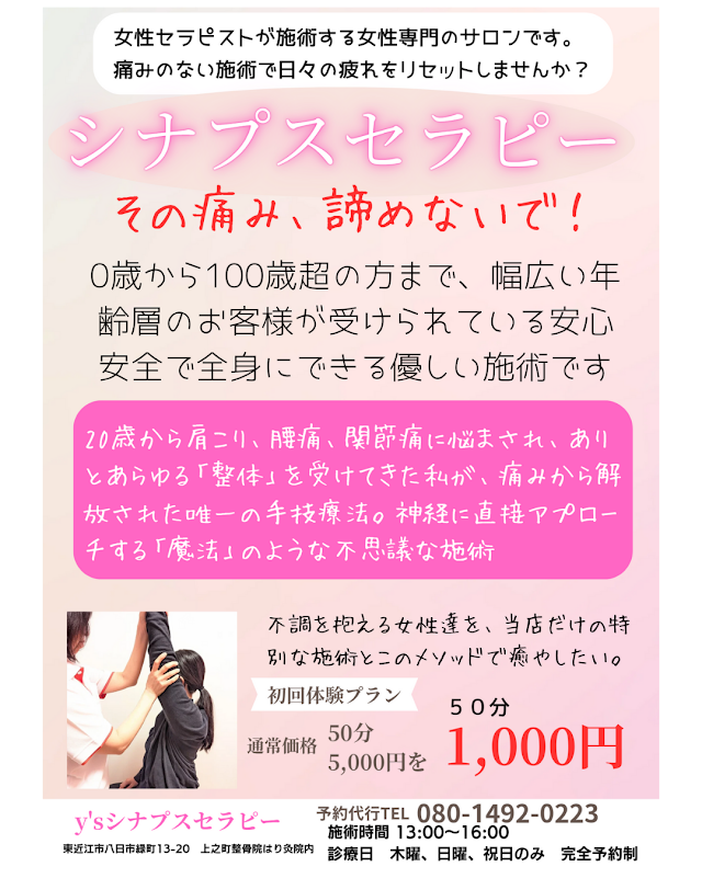 - この技術は、非常にソフトな刺激でありながら、神経伝達異常の箇所に作用することで、自己治癒力や神経機能の改善を促すとされています。強い圧をかけたり、揉んだりする施術ではないことが強調されています。